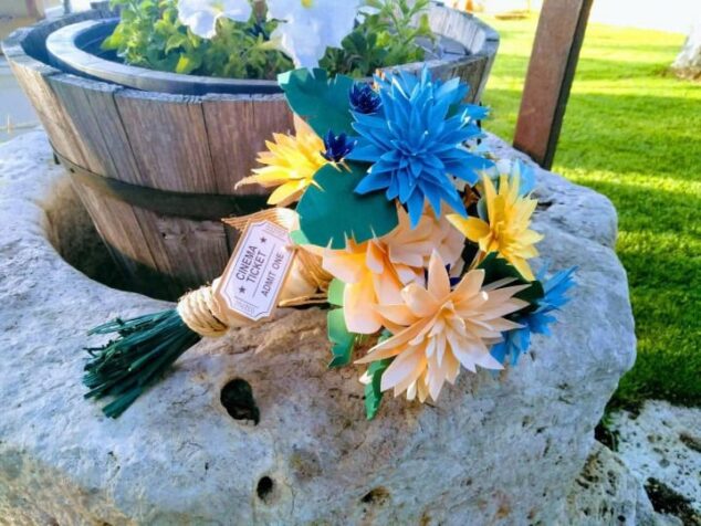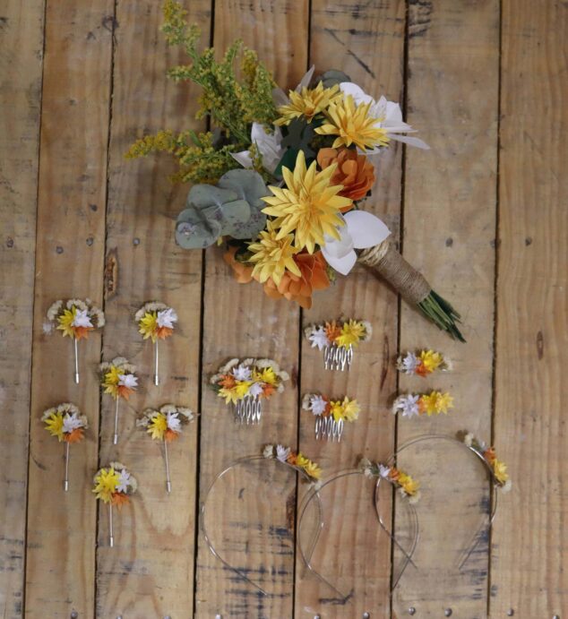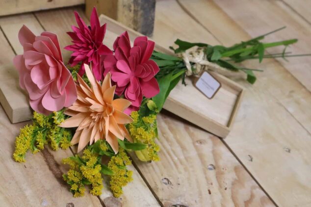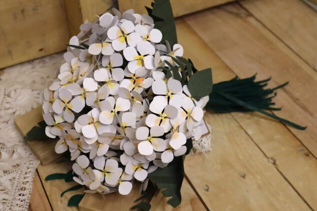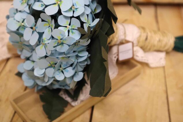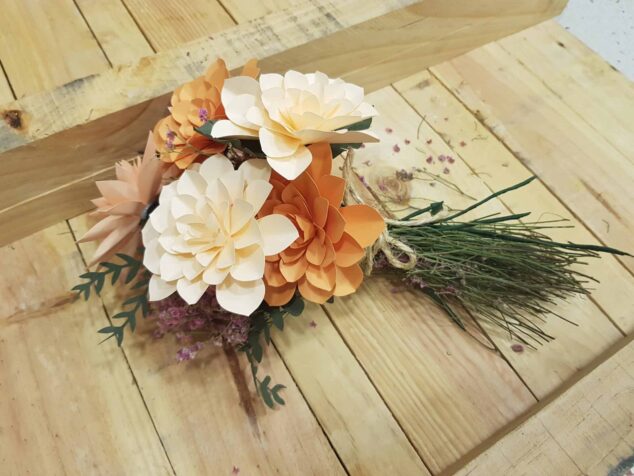 Los ramos de flores de papel recortado son delicados y permiten una total armonía con las flores secas de relleno con la paniculata o la siempreviva.
