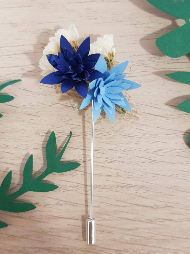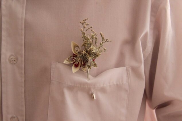 Tanto el padrino, la madrina o los testigos, pueden llevar boutonnières de Missmsmith hechos con papel y una aguja de plata. Se puede incluir también una flor seca como acompañamiento.