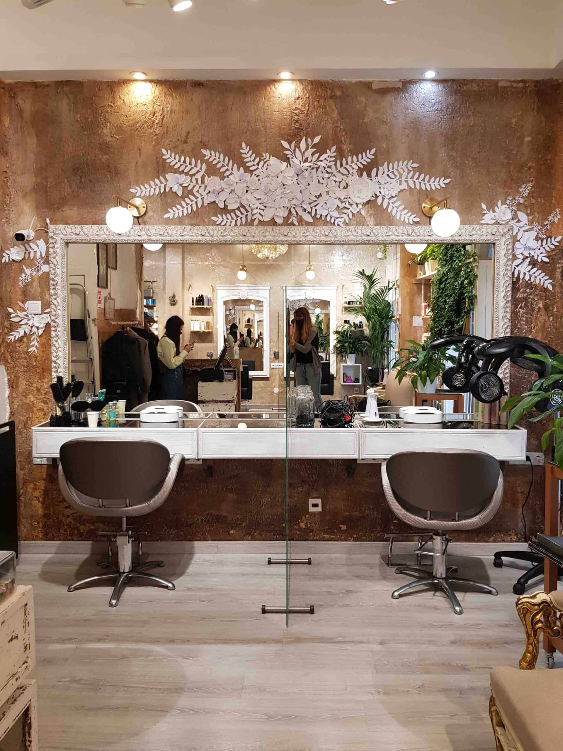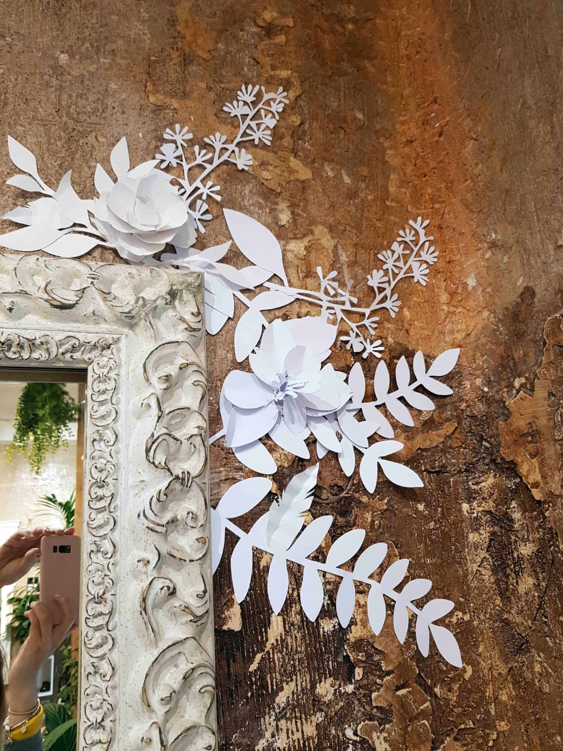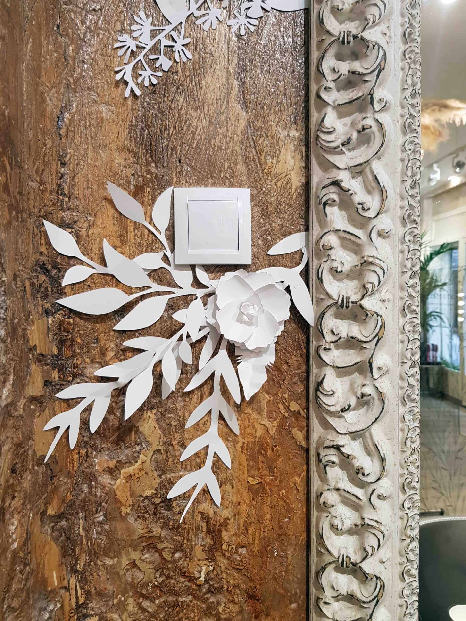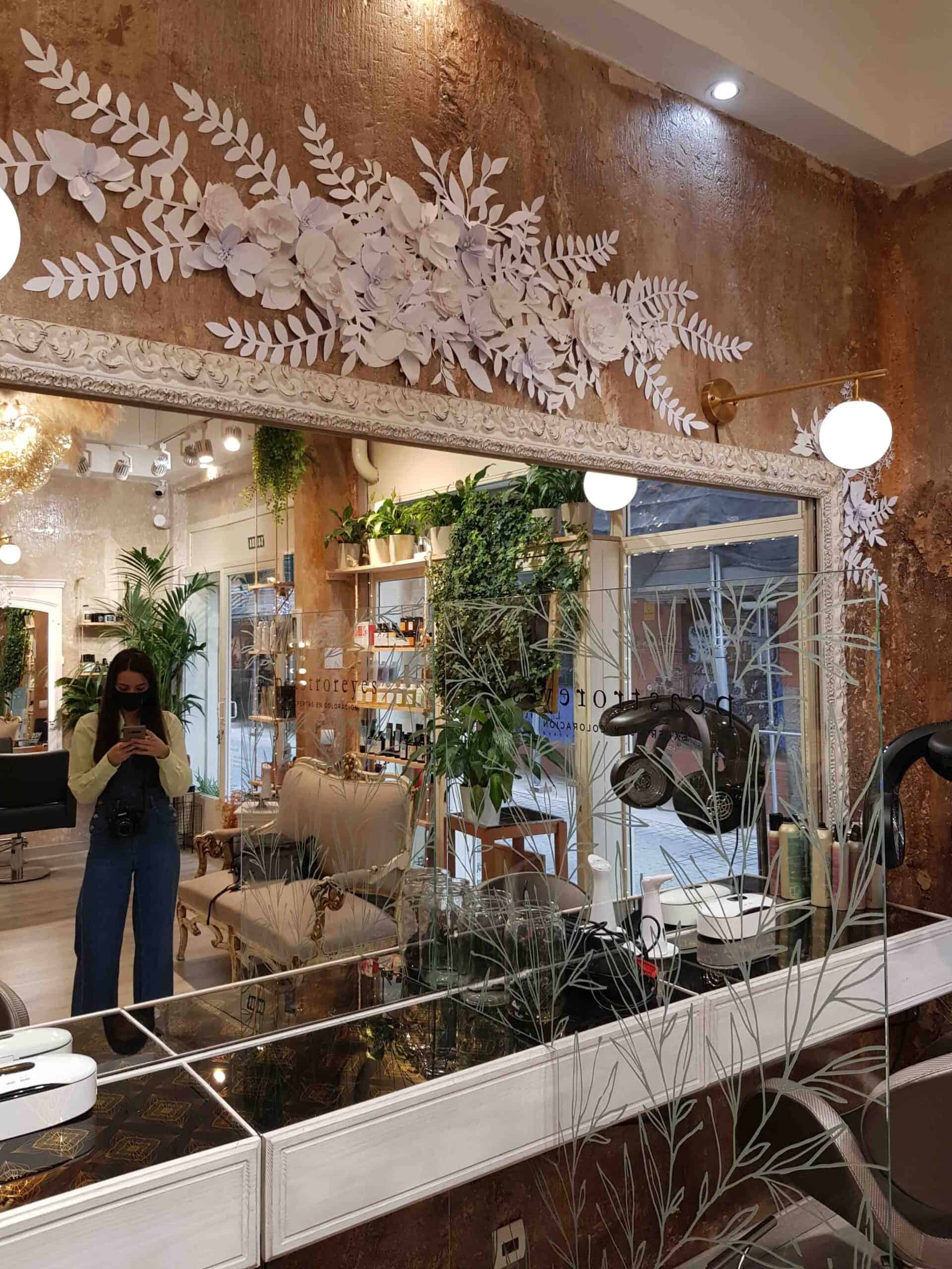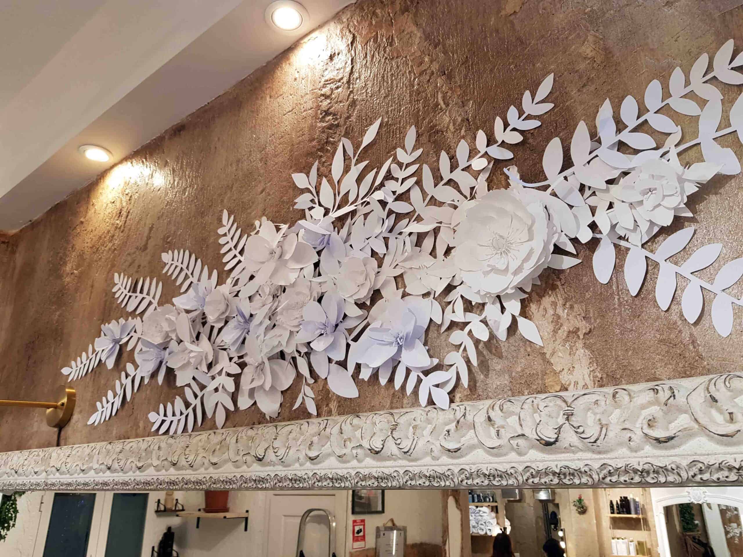 Con vegetación en papel de 250g hemos creado cascadas de papel para el salón de belleza Pcastroreyes en la Calle Santa Ana en Madrid. Una decoración sutil muy acorde con el espacio que acompañó a la perfección las molduras y la rugosidad de las paredes.