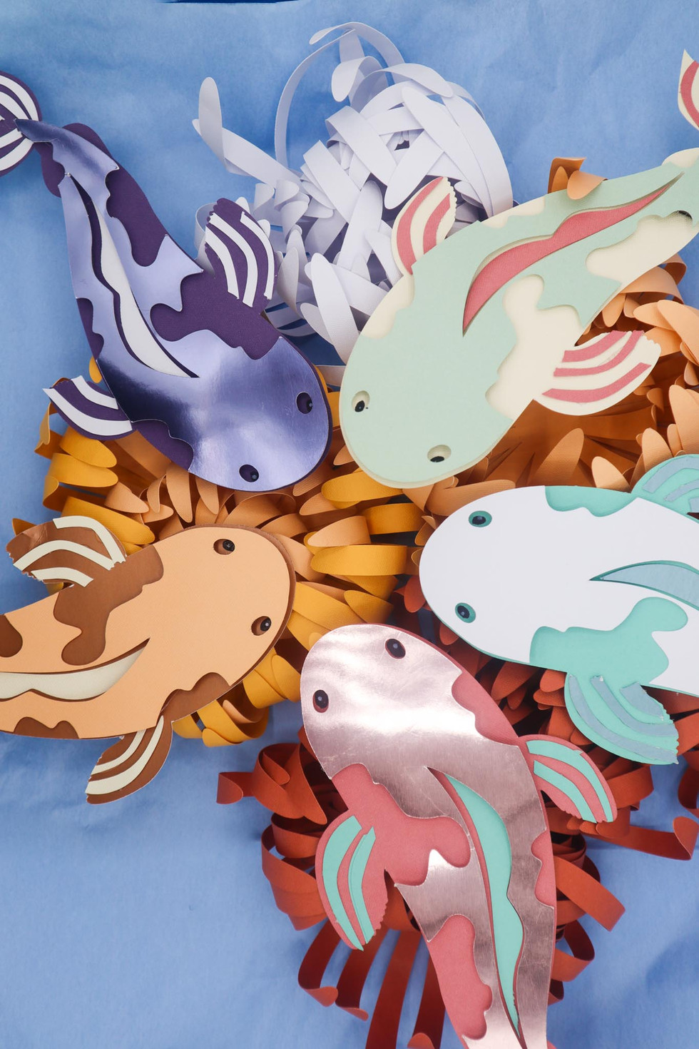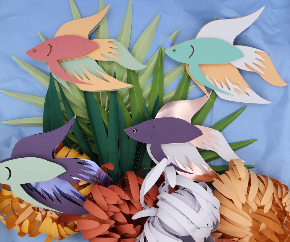El pasado mes de septiembre, tuvimos el placer de preparar las creatividades de papel para el stand de Vidrepur en la feria Cersaie de Bolonia. Para nadar entre su colección de mosaicos de piscina, nuestros peces acompañaron cada línea de sus tonalidades disponibles.