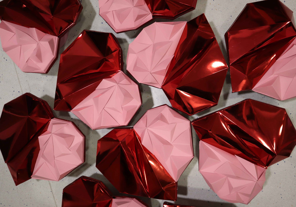 Los corazoncitos de papel se han adueñado de escaparates de todo el mundo en versión maxi compuesta de mitad metalizada en rojo y otra parte compuesta por geometrías de color rosa. De remate, una cerilla a modo de flecha lista para encender la llama.