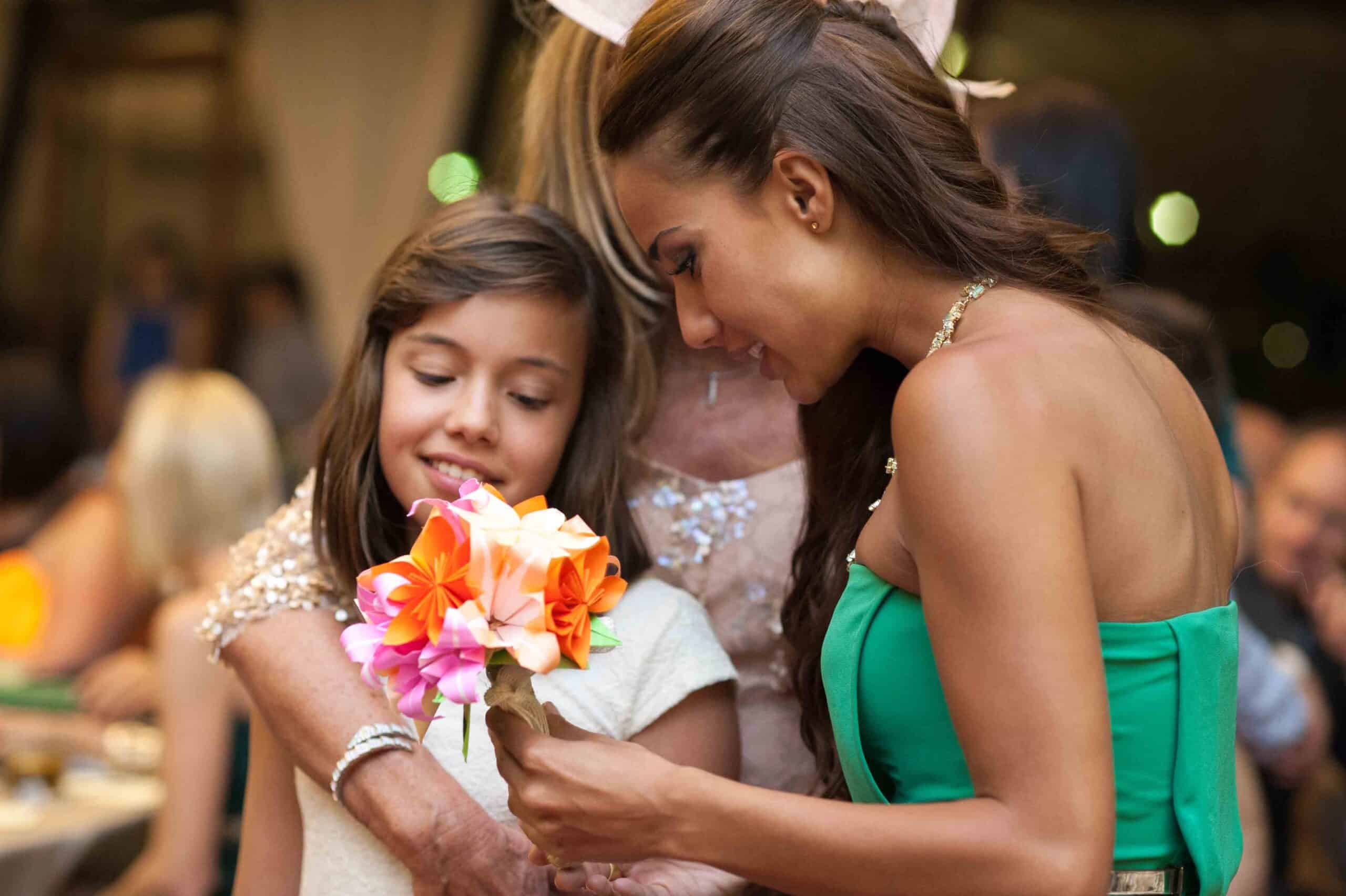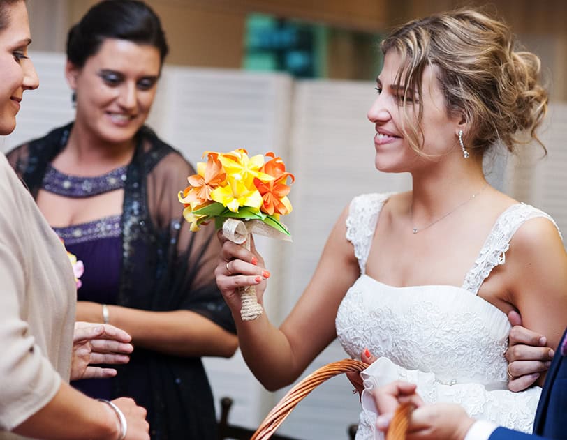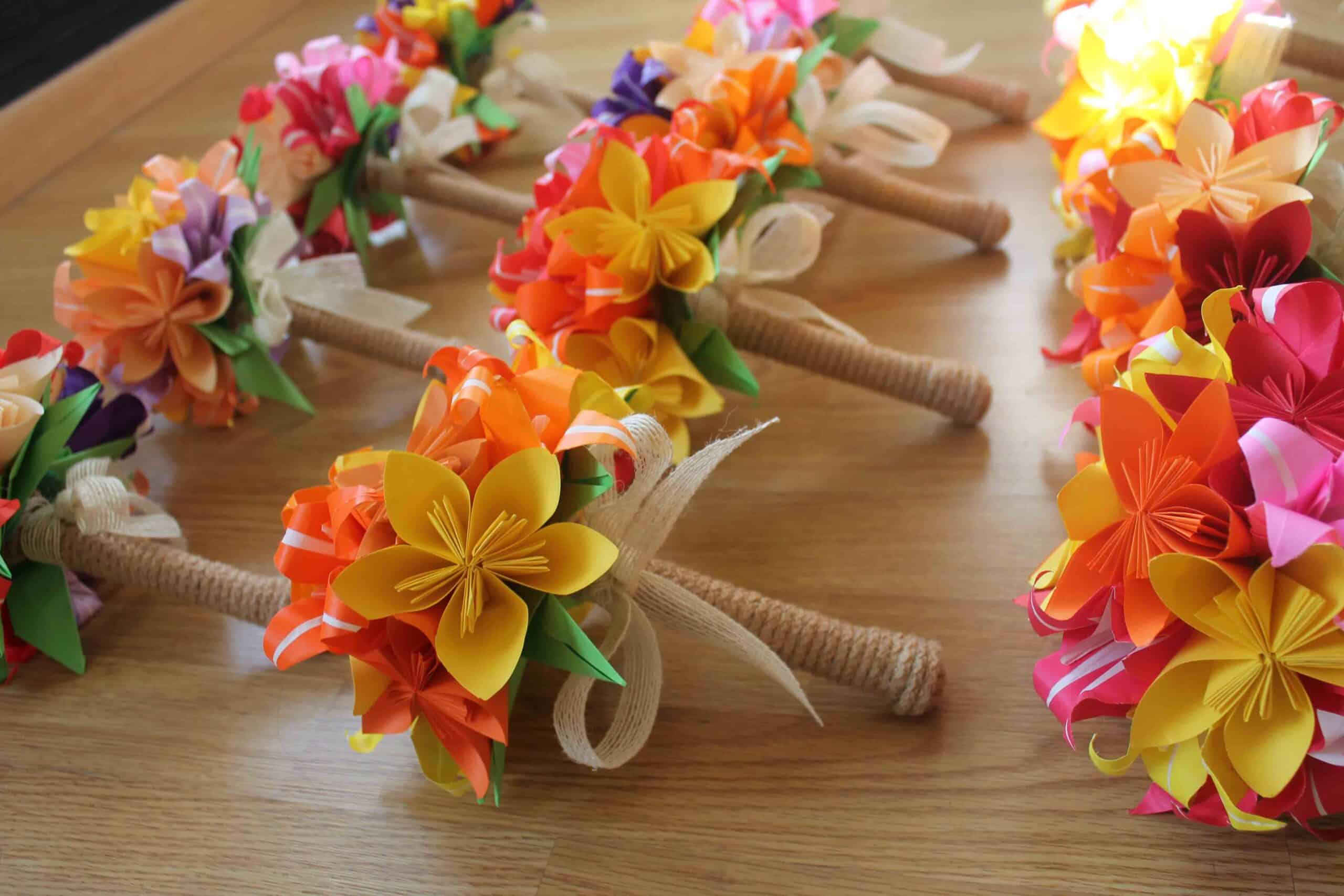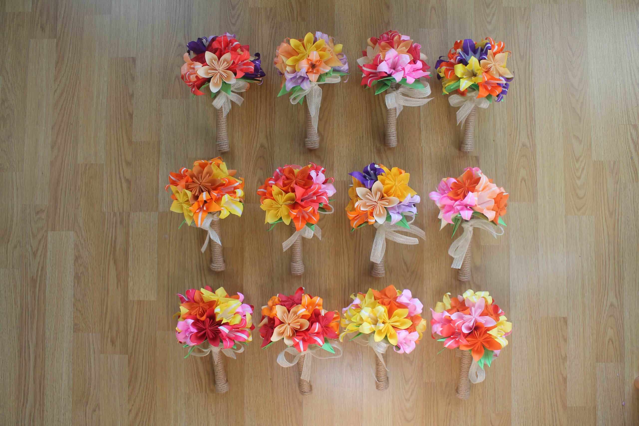 Durante la boda de Loreto, el papel tuvo un papel muy importante. Cada una de las invitadas da la celebración recibió un ramito de flores de origami que desde Missmsmith – Ate en papel preparamos con mucho cariño. Todos diferentes y llenos de color, la novia los entrego después del banquete.